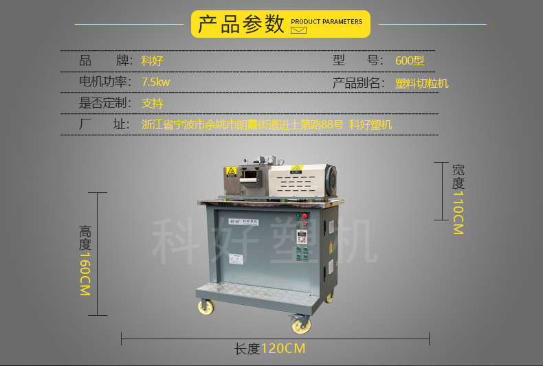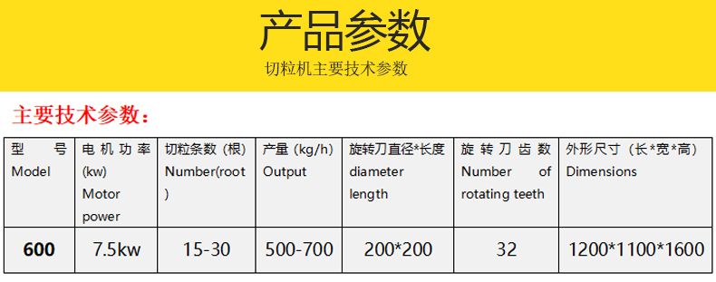 用途:600型塑料切粒機,建議切條數在15-30根,產能600kg/h。